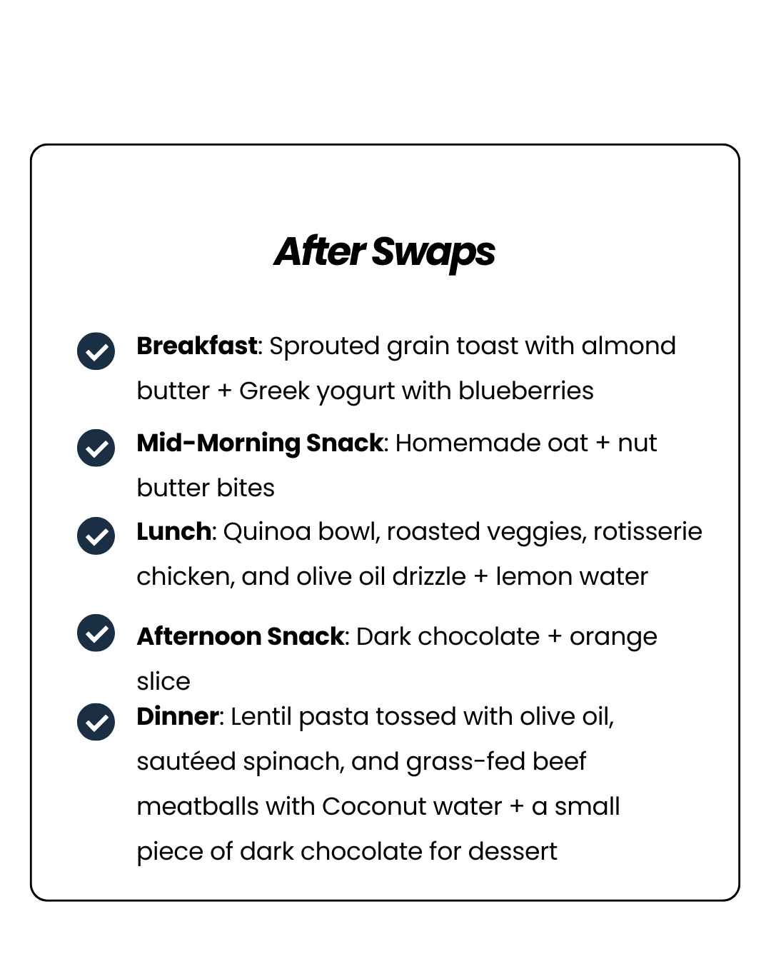 👉 Notice the difference? The “After” day doesn’t sacrifice carbs (as runners, you still need them!) but balances them with quality protein, anti-inflammatory fats, and nutrient-dense foods that actually support training adaptations instead of holding them back.
